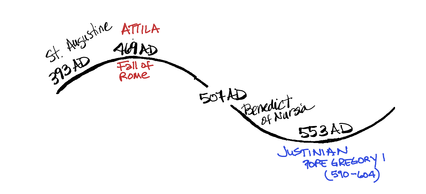 In the beginning of the next cycle, the visionary is none other than Augustine of Hippo, the man who invented sin, original sin, heaven and hell, and evil. Okay . . . not exactly, but he often gets credit for these things. His teachings gave hope during a time when the Roman Empire was falling apart. It was at this Vision time that the Roman Emperor Theodosius forced all people in the empire to convert to Christianity. His soldiers destroyed the Library in Alexandria and killed Hypatia among other scholars at the time. At Power, Attila the Hun, along with the Visigoths, and the Vandals, invaded and took over the decaying Roman Empire. During this Justice time, Benedict of Nursia had an awakening experience and started his own monastic code. His work has inspired centuries of Benedictine monks and social justice activists. At Reform, the Emperor Justinian of the recently formed Byzantine Empire (330 - 1543) instituted legal reforms that benefited the people.
