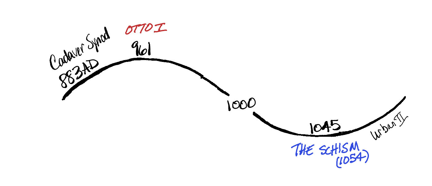 The beginning of the next cycle included a rather twisted time period in Church history. It was called the Cadaver Synod. It involved the cadaver of Pope Formosus (p. 891 - 896) that was put on trial (897) by the pope who succeeded him, found guilty and the three fingers used for blessing were cut off the corpse. The pope that followed after that was still pissed at Formosus, so he had the body dug up again and put on trial again, and this time decapitated. This began a dark time in the church that lasted throughout this cycle. During the Power time, Otto the Great, often given credit for starting or expanding the Holy Roman Empire (962 - 1806), used the support of the papacy to enhance his ambitions. During Justice, it seemed like the whole world started writing great works including the Tale of Genji in Japan, Beowulf in England, and for the Catholics, Burchard of Worms wrote the Decretum, a work of canon law for the Church. By Reform, the Church fell apart into what is known as “The Schism” (1054). For various reasons of doctrine and politics, the Russians and the Greeks split off from the Catholic Church and formed the Russian Orthodox (c. 988 between Power and Justice) and Greek (aka Eastern) Orthodox Churches (c. 1054). At the very end of the cycle, Pope Urban II tried to strengthen the power of the church by sending crusaders to attack and conquer Jerusalem, which they did.