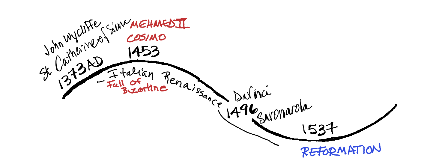 In the beginning of the next cycle, while the Church was in another schism with one pope in Rome, Italy and another pope in Avignon, France, my favorite mystic saint, St. Catherine of Siena, lived. This badass 18-year-old rode a horse from Siena to Avignon, probably taking a month, managed to get an audience with the pope and tried to convince him to make up with the Italian pope in Rome. Eventually they did and Rome continued to be the center of the Catholic Church, thus the name Roman Catholic Church. Another visionary at Vision was John Wycliffe, a professor monk, in England who started speaking out about the corruption in the Catholic Church. At Power, Cosimo de Medici wrangled himself into the good graces of the pope and the pope’s coffers. Taking over the Vatican Bank, a huge source of wealth at the time, Cosimo moved into a great deal of power and influence. Meanwhile, the Byzantine Empire fell when Mehmed II, the leader of the Ottoman Empire, conquered the city of Constantinople. Constantinople was a strategic port city, and Mehmed took advantage of that by blocking trade routes between Europe and Asia. This led to the Catholic Church instituting policies against the Muslims, that were broad enough to include all non-Christians. At Justice a whole bunch of stuff went down. Lorenzo de Medici, Cosimo’s grandson and current leader of Florence, died and left Florence in the hands of his son, who wasn’t up for the job. This opened the doors for a fire-and-brimstone Dominican monk, Savonarola, who went on a sermon-binge, shouting out against the corruption in the church. Meanwhile, the newly elected Spanish pope, Alexander VI (Rodrigo Borgia) benefited from Columbus’ trip across the Atlantic, signed the Treaty of Tordesillas, split up the newly discovered lands across the Atlantic between Portuguese and Spanish conquistadors and then sent his own General son, Cesare, on a campaign of battles. By the time of Reform, several Catholic monks, Martin Luther and Huldrych Zwingli (and others) woke up the masses with missives and sermons that led to massive demonstrations called the Reformation, that led to more splitting in Christian-dom.