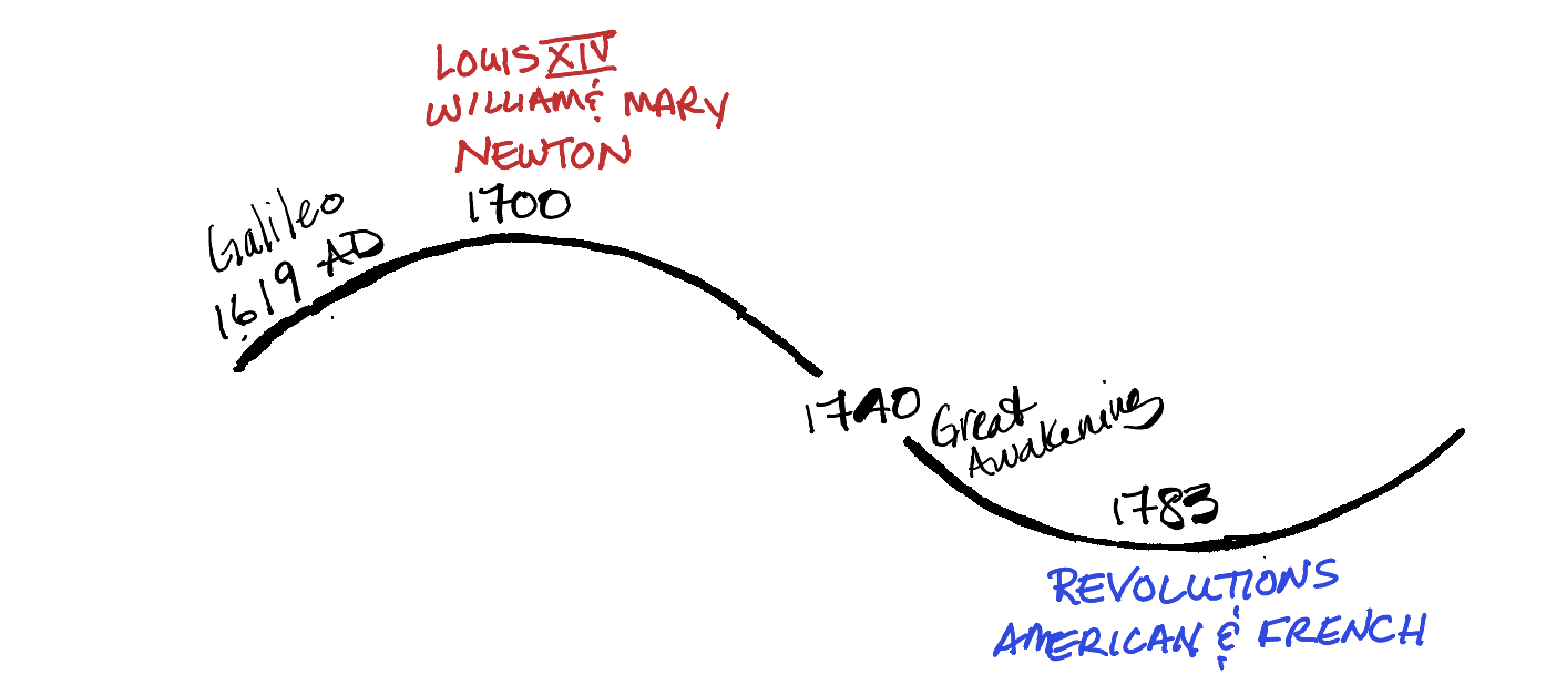 In the beginning of the next cycle, Galileo, a Catholic who considered becoming a monk, saw the moons of Jupiter with the newly invented telescope that led people to think that if they could see the invisible then maybe they could control nature. He brought out the work of Copernicus and was imprisoned for it (house imprisoned). At the same time, Francis Bacon in England started a movement called “science” from the Greek “to separate”, as in the separation of mind and spirit. The idea that we could separate out parts and study them empirically, was a new vision that supported the distancing of intellectuals from the Church, while the newly growing Protestant sects were getting established. By the time of Power, the Royal Society of London, a bunch of dudes smoking cigars in red velvet chairs (at least that’s what it looks like in my mind) decided to really separate church and state by taking all the mystery out of gravity (Newton) and pressures (Boyle) and politics (Locke) and commerce (East India Trading Company). By Justice, David Hume and Voltaire and other “Enlightenment” thinkers were stirring up trouble in the colonies and in France. By Reform, all that Enlightenment talk emboldened colonists in the invaded territories of the “New World” and some radical French activists in the “Old World” to start revolutions and create a real and lasting separation of church and state.