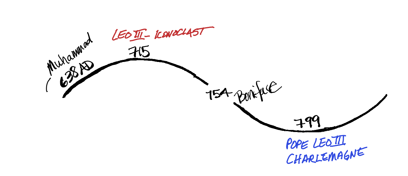 In the beginning of the next cycle, the visionary Muhammad (c. 570 - 632) lived down in the deserts of Arabia. Muhammad started his own religion and his followers took the work in a very different direction than Christianity. At Power, while the followers of Muhammad were building an empire, the Christian Byzantine Emperor, Leo III, started a nasty time period of destroying all the icons—statues and artwork—of the Christians and others. During Justice, the monk, St. Boniface, helped the Church form an alliance with Germania and the Francs (roughly Germany and France of today). During Reform, the pope blessed Charlemagne’s coronation and the two started a pact that merged church and state into what later became the Holy Roman Empire1. The Carolingian Renaissance (800 - 887) that Boniface made possible, began with Charlemagne and introduced a time known for its art and architecture.