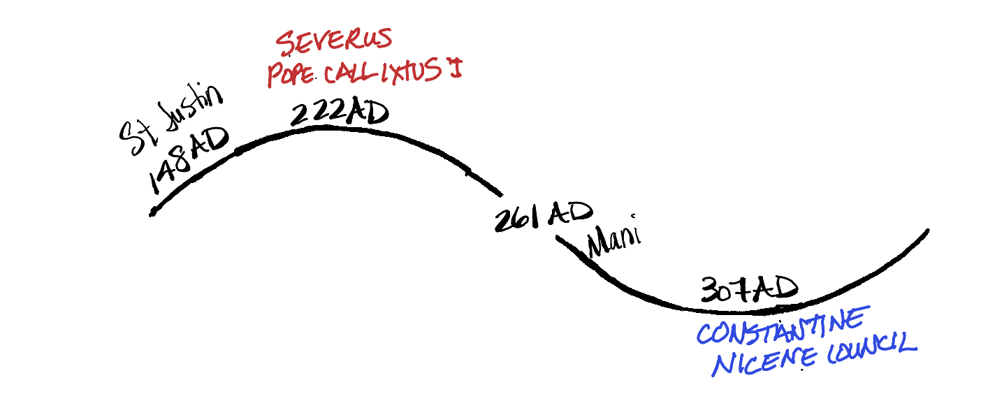 In the beginning of the next cycle, a Greek philosopher, named Justin, later called Justin Martyr, combined the teachings in the gospels with the teachings of Aristotle and other Greek philosophers. His writings informed the direction of Christianity during a time when Christians were being killed. At Power, Pope Callixtus was killed in a slew of Christian killings. By the time of Reform, Emperor Diocletian worked overtime to put down the Christian movement killing thousands of Christians in just a few years. Diocletian died and the next Emperor, Constantine, took a radically different approach. He convened a council, the Nicene Council (306), to create the core doctrines of a new religion for the Christians and then made Christianity legal. Then he converted to this new religion (312). Constantine made sure to keep the pagans happy, continuing to support their holy days by making the Christian holy days align with the pagan ones, basically allowing freedom of religion.