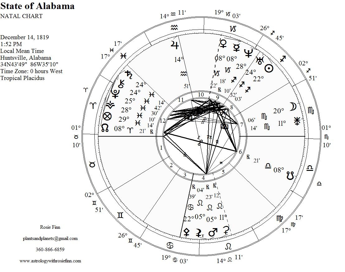 In addition to the Mars-Pluto transit, the March eclipse at 26° Pisces will be hitting AL’s Saturn, and the March eclipse at 9° Aries will be hitting AL’s North Node. That means that the eclipses will be triggering the soul of this state.